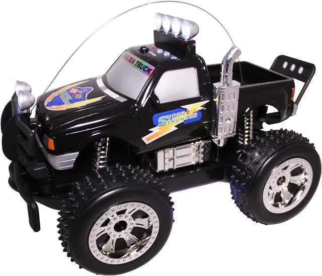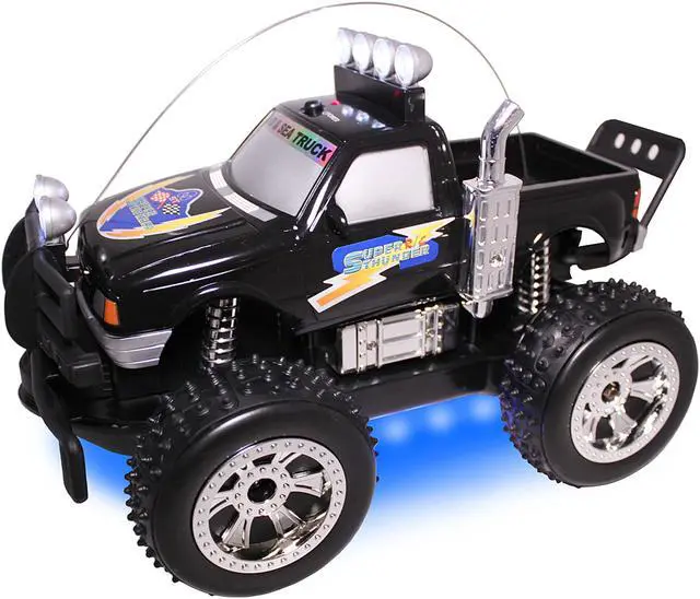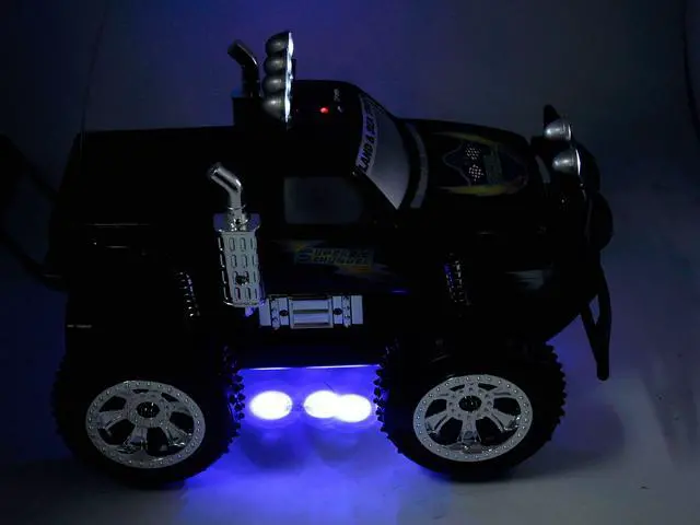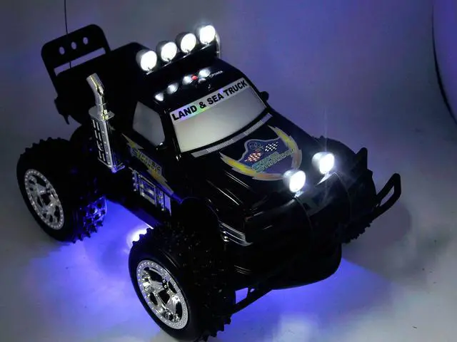 This is a battery-powered, remote controlled 4-wheel drive toy truck designed for children 8 years old and up. It runs on all terrains - ground, grass, sand and ice, and even keeps going when in water thanks to the two built-in propellers. The lights on the top of the truck, front of the hood and beneath the chassis give it the ability to see and be seen in the dark, making it perfect for night driving. Control is at your fingertips with the full function wireless radio handset, which supports operation range of up to 70 feet.