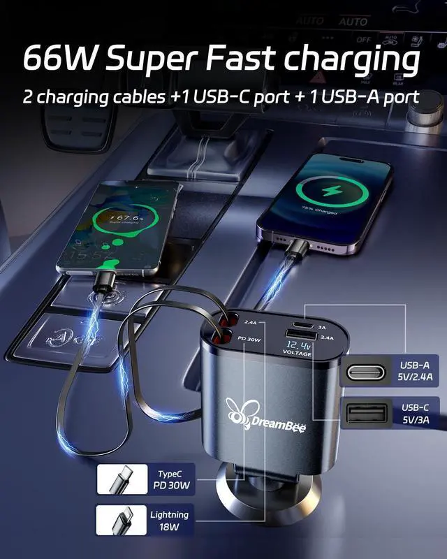 DreamBee Retractable Car Charger,66W 4 in 1 Super Fast Charge Car Phone Charger,Retractable Cables (31.5 inch) and 2 USB Ports Car Charger Adapter for iPhone 15/14/13/12 Pro Max XR,iPad,Samsung,Pixel