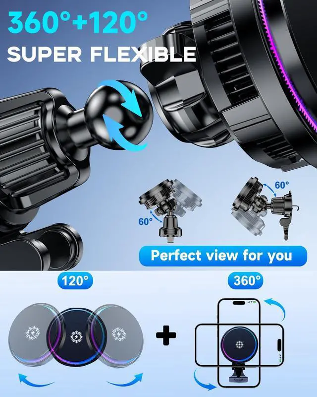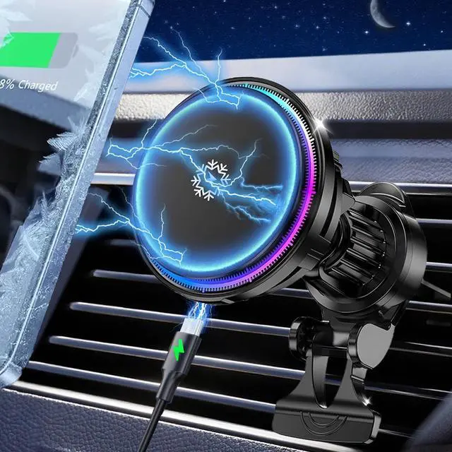 Smart RGB Light Car Mount for MagSafe Charging Our Magnetic car charger compatible with Magsafe Function and RGB Light, You can accurately find the car charger after starting the car in the dark, and its designed to create the perfect mood for every drivers' experience, that can create a comfortable ambience, or a vivid, bright and refreshing driving atmosphere, and The RGB lights will automatically turn off after stable charging, If no phones charging RGB light and Cooling will stop after 80s.