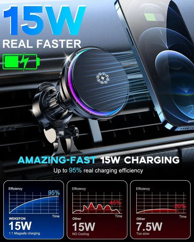 WEKEFON for MagSafe Car Mount Charger with RGB Light, 15W Ice Cooling and Fan Magnetic Wireless Car Charger Phone Holder, Air Vent Fast Charging for iPhone 17 16 15 14 13 12 Pro Max Air Mini Plus, for Samsung Galaxy S25, Perfect for Gifts, Follow were the main features of the car charger: