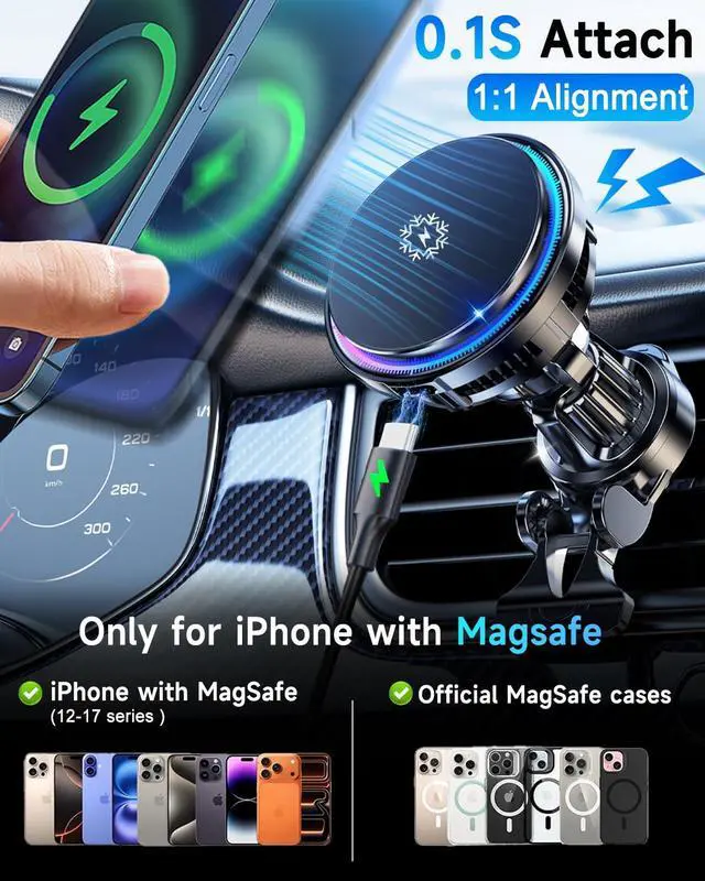 2026 Upgrade Dual Cooling 100% Stay Cooler, Phone-cooling fan and innovative semiconductor cooling heat-dissipating components keep your phone cooler during charging, maintaining maximum charging speeds. This increases your charging efficiency by about 45%, compared to standard for magsafe car charger, Let's get rid of the dilemma of charging your cell phone in car and heating up forever !