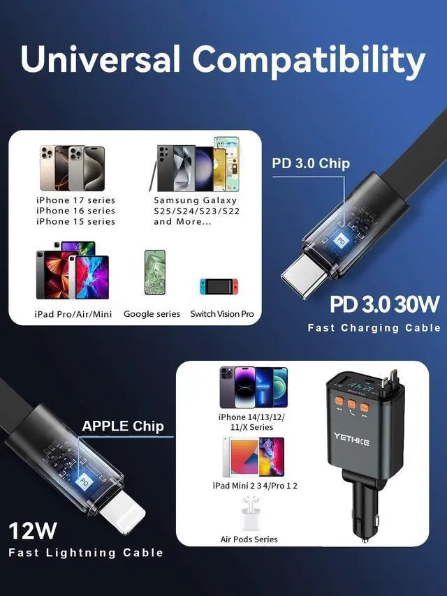 A:Includes Dual Cables: One iPhone charging cable (supports up to iPhone 14 series) and one Type-C cable. Extensive Compatibility: Fast-charges all Android phones supporting PD/QC protocols, iPhones (up to 17 series), iPads, and even some lightweight laptops.