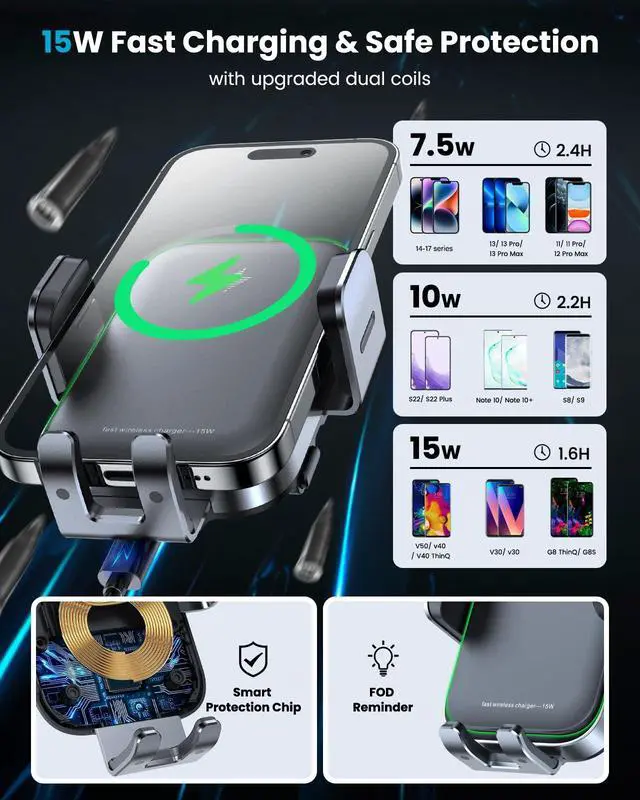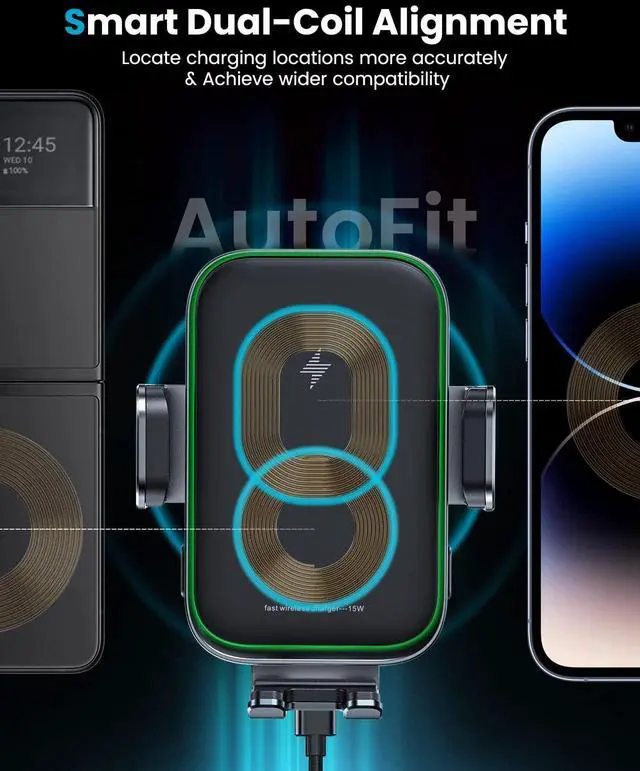 | Dual-Coil Wireless Charger | Auto-Locating & Clamping | Advanced Semiconductor Cooling | Glue-Free Suction Cup |