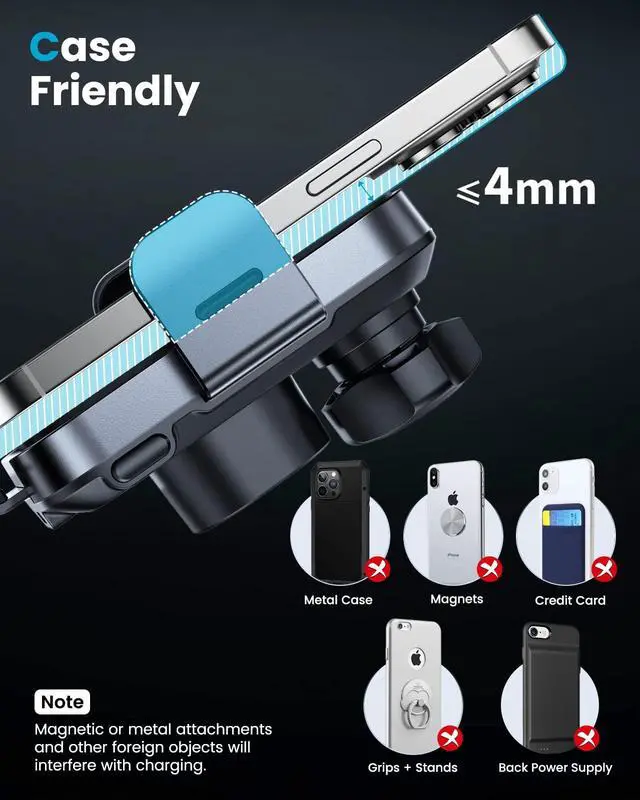 NOTE: A mobile phone case that is too thick will affect the coil induction to identify the mobile phone, thereby affecting the automatic clamping of the clamp arm, and will also reduce the charging efficiency.