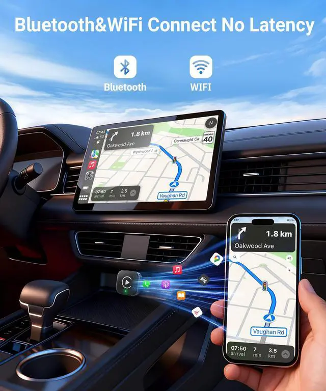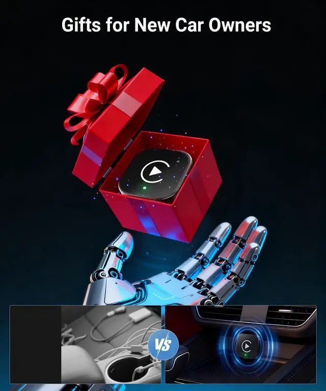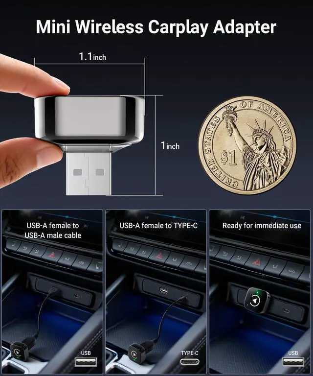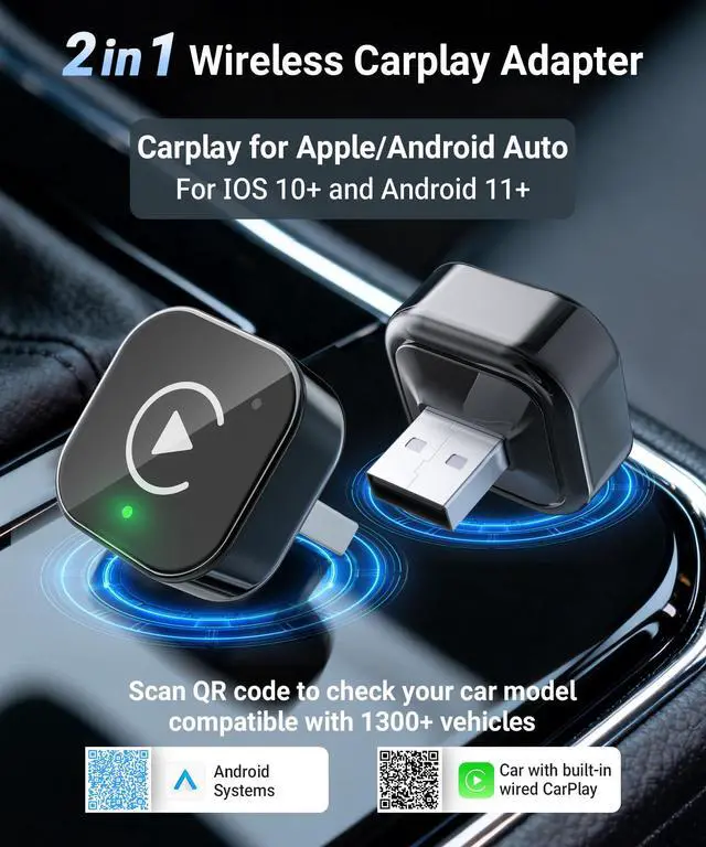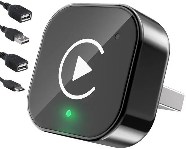 Transform Your Drive with Wireless Freedom Say goodbye to tangled cables forever! The TICARVE Wireless CarPlay Adapter instantly upgrades your factory-wired system, giving you the wireless convenience you deserve without the clutter. Why Choose TICARVE Wireless CarPlay Adapter? Instant Wireless Conversion Convert any factory CarPlay or Android Auto system to wireless in seconds. No more fumbling with cables every time you get in your car. Lightning-Fast Performance Dual-band 2.4GHz + 5.8GHz WiFi chipset ensures zero-lag streaming, real-time navigation updates, and crystal-clear audio quality. Universal Compatibility Works seamlessly for iPhone 6+ (iOS 10+) and Android devices (Android 11+). Compatible with all vehicles that have factory-wired CarPlay or Android Auto systems. Advanced Heat Management Proprietary heat dissipation technology prevents overheating during long drives, ensuring consistent performance and safety. Complete Package Includes: 1x TICARVE Wireless CarPlay Adapter 1x USB-A to USB-A Cable 1x USB-A to USB-C Cable 1x Quick Setup Guide 24-Month Warranty Certificate Simple 3-Step Setup: 1. PLUG - Connect adapter to your car's USB port 2. PAIR - Connect your phone via Bluetooth (one-time setup) 3. DRIVE - Enjoy automatic wireless connection every time Your Investment is Protected: FCC Certified for safety and reliability Free lifetime firmware updates 24-month hassle-free warranty 24/7 customer support 30-day money-back guarantee Upgrade your driving experience today! Join thousands of satisfied customers who've eliminated cable clutter and embraced wireless convenience. Note: Requires vehicle with factory-wired CarPlay or Android Auto system. Enable WiFi and Bluetooth on your device for optimal performance.