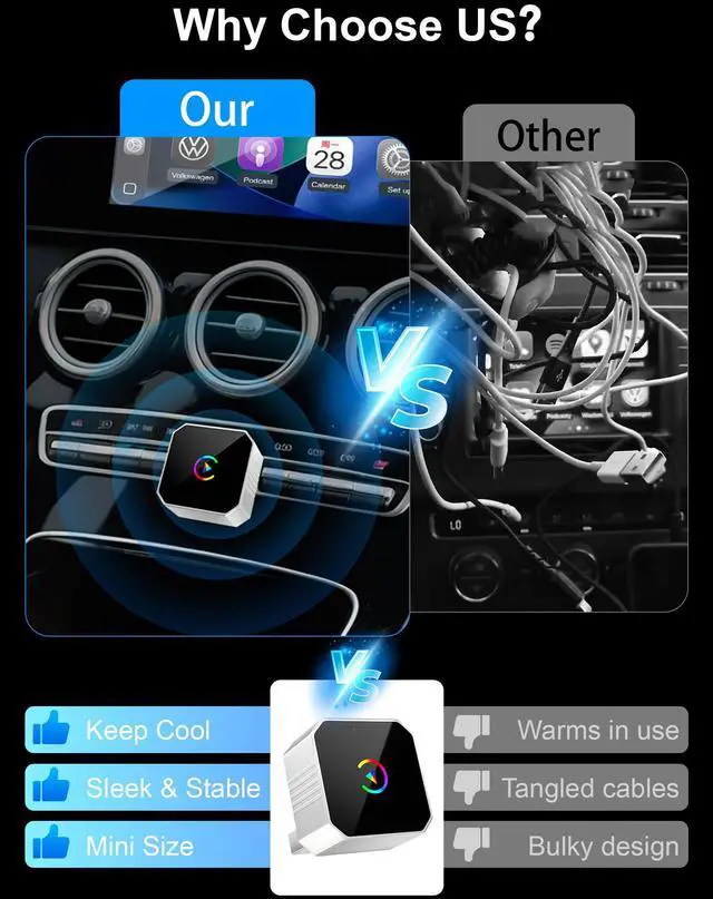 - Our Compact Wireless Car Play Features a Low-profile Design that Integrates Discreetly with Your Vehicles Interior. Tested for Durability Under Vibration, It Is Engineered to Stay Securely in Place During Driving, Providing a Tidy and Reliable Wireless CarPlay Solution.