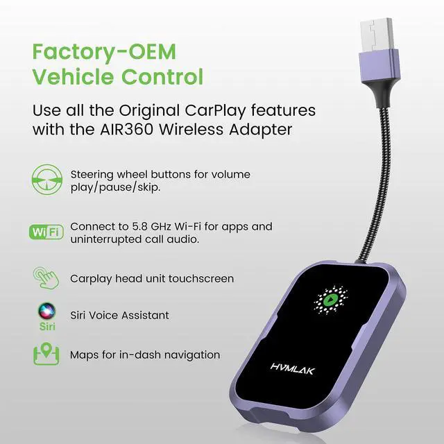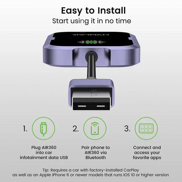 AIR360 Carplay wireless adapter comes with compact design enhances usability by making products easy to handle, store, and operate in daily scenarios, ensuring convenience and practicality for users.