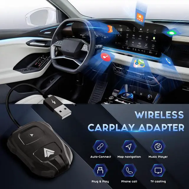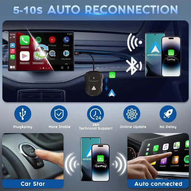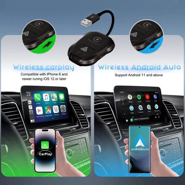 - [Compatible with 1200+ Models] 2024 upgraded wireless carplay adapter has a wide range of applications and is currently compatible with more than 1200 car models as well as iPhones and Android phones. Please note that your car must have a factory wired CarPlay system to use this adapter. Please note that this adapter requires an iPhone 6 or later running iOS 10 or above, as well as an Android smartphone supporting Android Auto function with Android 11 or higher.