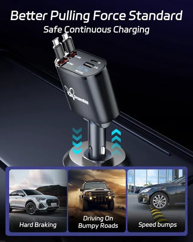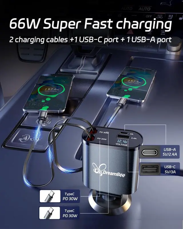 Upgraded 4-in-1 Fast Charging SolutionDreamBee car charger comes with dual true PD30W fast-charging Type-C retractable cables, and additional USB-C and USB-A ports for fast charging up to four devices simultaneously. No need for multiple chargers, just one compact device for all your charging needs