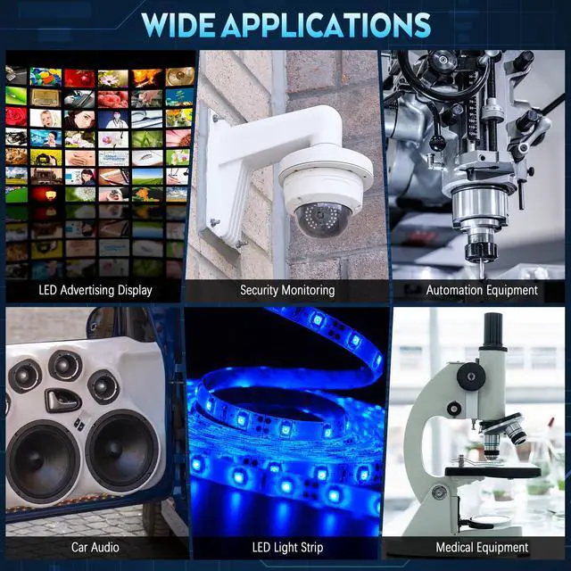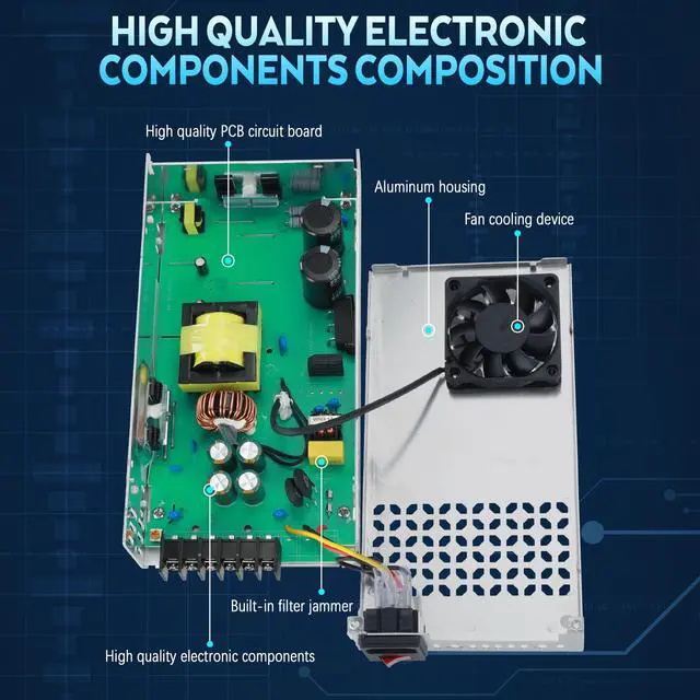 110V to 24V transformer built-in intelligent temperature control fan, the shell is made of aluminum + porous design, better heat dissipation; Note: the fan will only run when the power supply device reaches a certain operating temperature, open the fan is not yet working is a normal phenomenon.