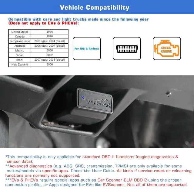 | EV Compatibility | Partially supported on electric vehicles when used with specific apps such as Car Scanner ELM OBD2. |