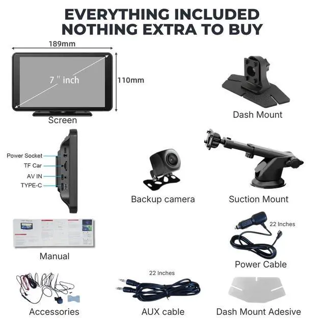 Seven Inch HD Touch Screen Display: Responsive 7 inch carplay screen with crystal clear resolution; portable wireless car stereo features intuitive touch controls. car tablet design mounts easily on dashboard for optimal viewing. High-brightness LCD display clearly visible in daylight and sunlight.