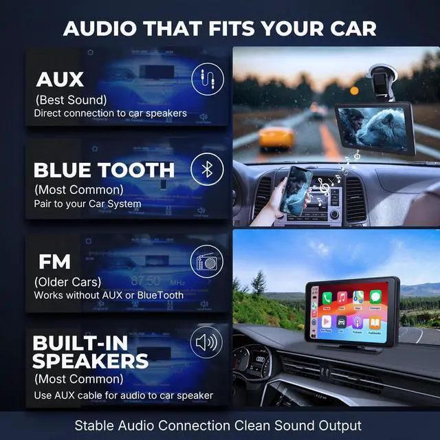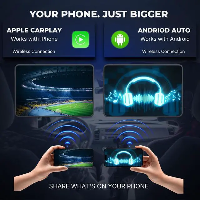 Wireless Apple CarPlay and Android Auto: Instantly add wireless carplay screen to any vehicle; portable carplay connects seamlessly to iPhone and Android devices; ideal apple carplay for older cars without built-in infotainment