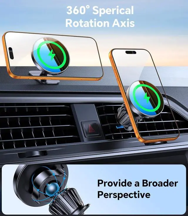 Vent base: The ultra-durable adhesive base design allows our phone mount for car magsafe charger for iPhone to adhere securely to the dashboard. It stays in place even on bumpy rides ensuring your phone stays stable. In addition for MagSafe car charger holder mount can be easily mounted to your car's vents providing you with a variety of mounting options for different usage scenarios.? 360° Rotationl & One