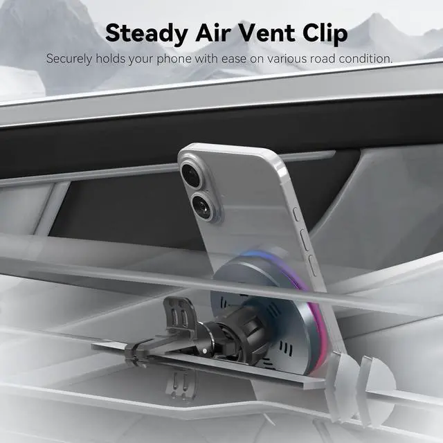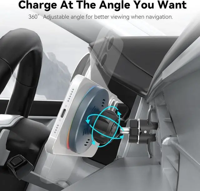 Cooling System: Lecork magnetic wireless car mount charger designed with 6 cooling holes and intellgient cooling system efficiently enhancing the charging speed during driving. This wireless car charger operates almost noiselessly providing cozy ambient lighting. Perfect for your Magsafe car phone holder needs. 360