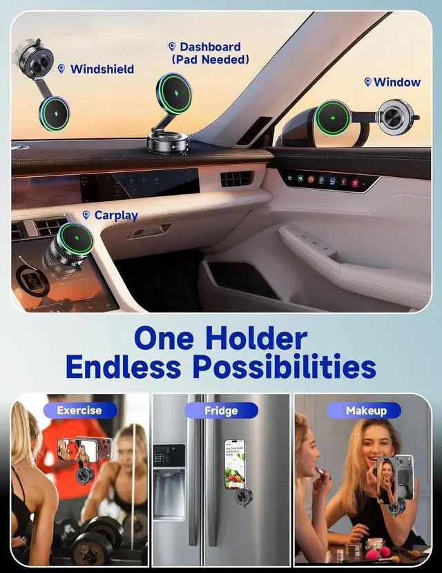 Flexibility: The car mount for iphone has a three-axis metal arm that can rotate 360° horizontally tilt forward and backward 270° and fold 180°. Wherever you place the car mount for iphone charger the screen will be perfectly aligned with your line of sight. Unlike traditional adhesive holders this magsafe car mount charger can be easily removed and repositioned allowing you to fix it at the perfect angle at any time without leaving any residueWide