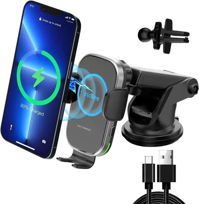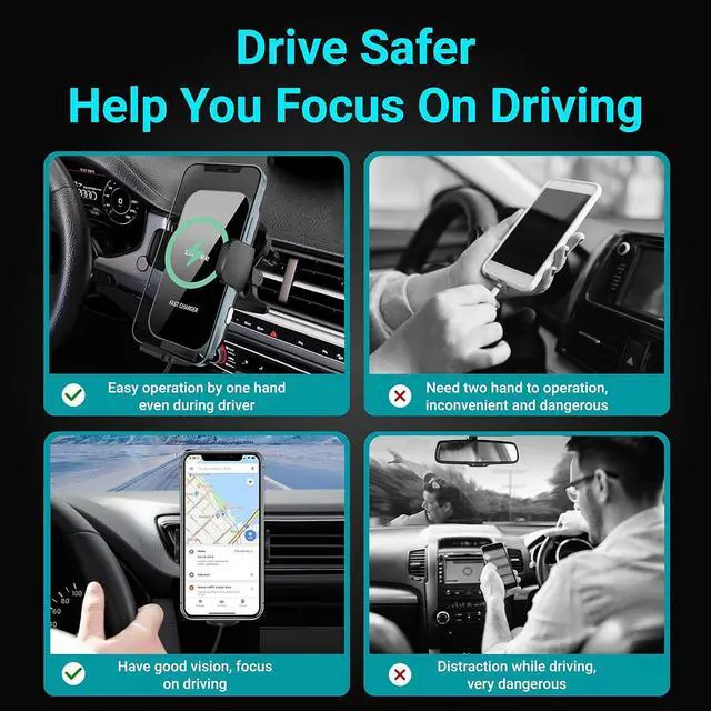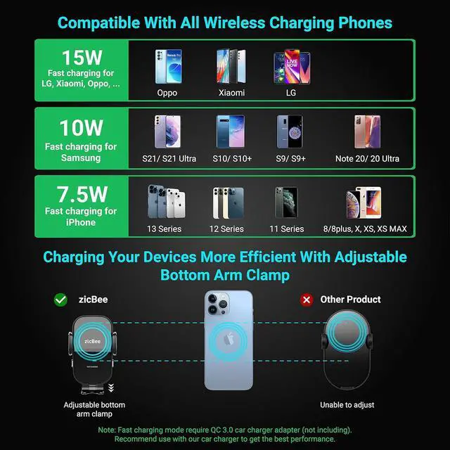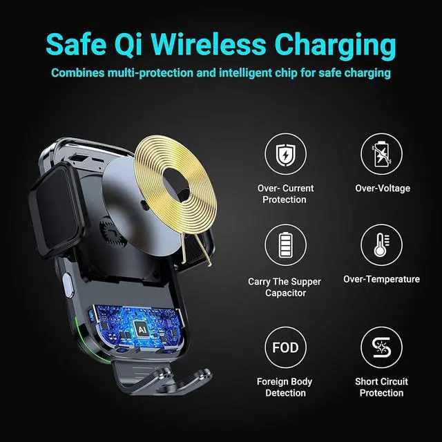 ?? Automatic closing with electromagnetic induction & Touch Switch With automatic electromagnetic induction the clamping arms can open and close automatically. The automatic closing function is realized through foreign object detection (FOD). As a result the clamping arms are more stable and with higher technology compared to the old product and will not open again by themselves.?? There are 2 metal buttons under the clamping arms You can touch the buttons lightly or press them firmly.?? 15 W fast charging & Fast heat dissipationCompatible with phone screen size under 6.3 in.