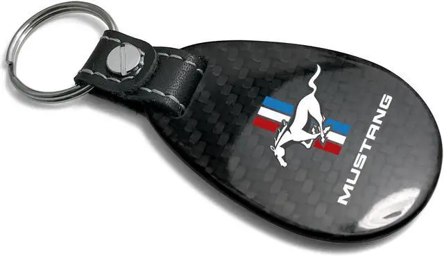 Ford Mustang Tri-Bar Real Black Carbon Fiber with Leather Strap Large Tear Drop Key Chain