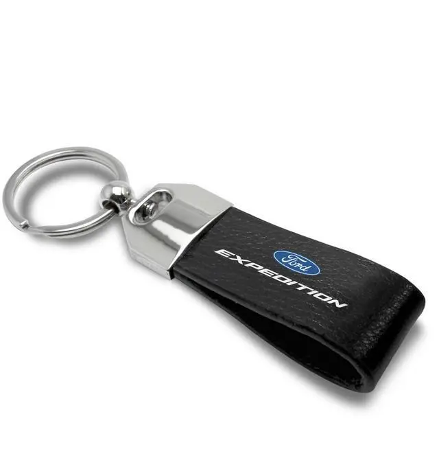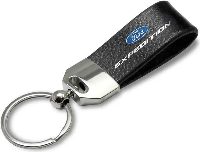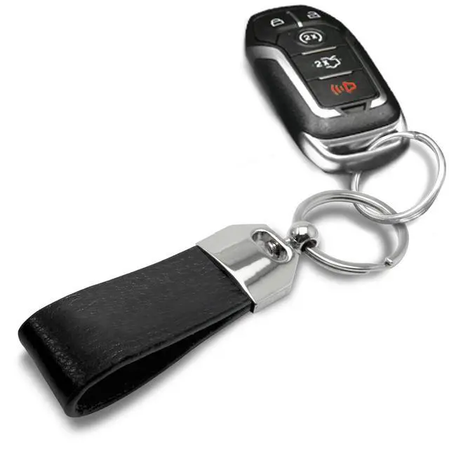 Fashion with style. One piece design has elegant look from every angle. Top grade soft black leather strip has full-color UV resistant OEM style car logo graphic. Chrome metal finish block has key rings for easy attach and release keys.