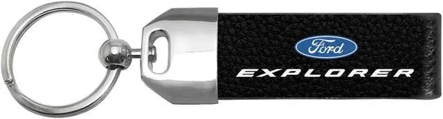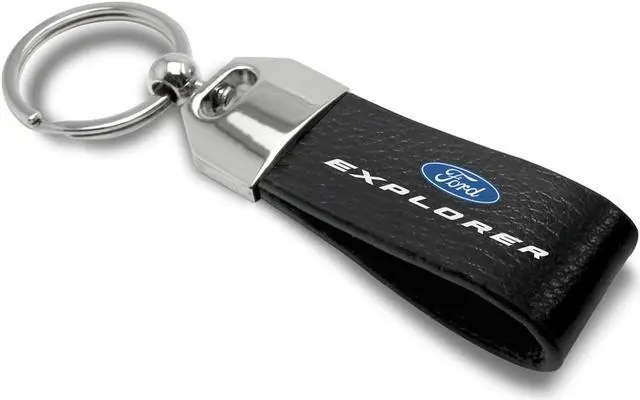 Fashion with style. One piece design has elegant look from every angle. Top grade soft black leather strip has full-color UV resistant OEM style car logo graphic. Chrome metal finish block has key rings for easy attach and release keys.