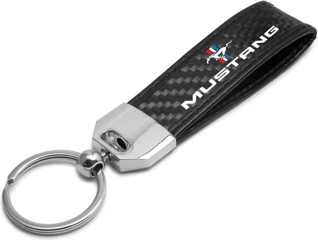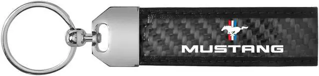 Ford Mustang Tri-Bar Real Carbon Fiber Leather Strap Key Chain with Black stitching