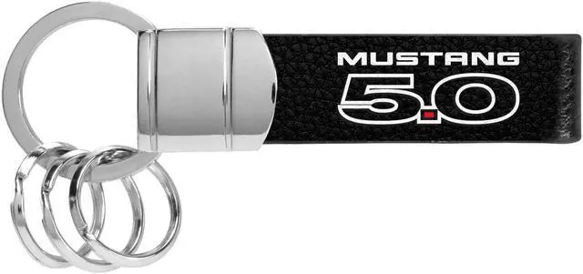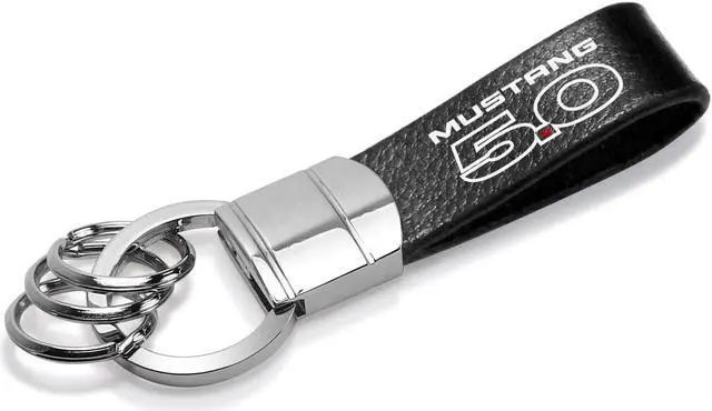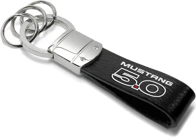 Ford Mustang 5.0 Black Real Leather Strap Chrome Round Hook Metal Key Chain