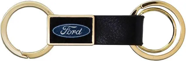 Fashion with style. One piece design has elegant look from every angle. Golden steel block with soft real black leather insert. It has full-color UV resistant OEM style car logo graphic. Black leather stripe with double rings for easy attach and release keys. Carabiner style snap hook on one end.