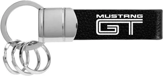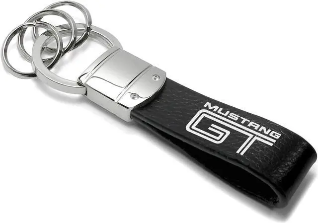 Ford Mustang GT Black Real Leather Strap Chrome Round Hook Metal Key Chain