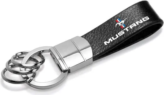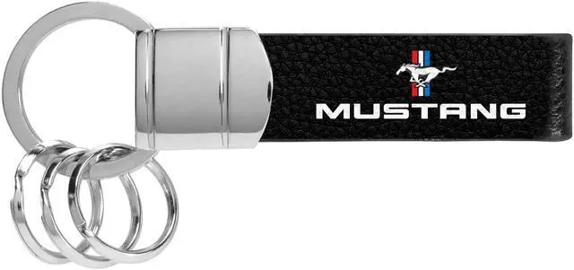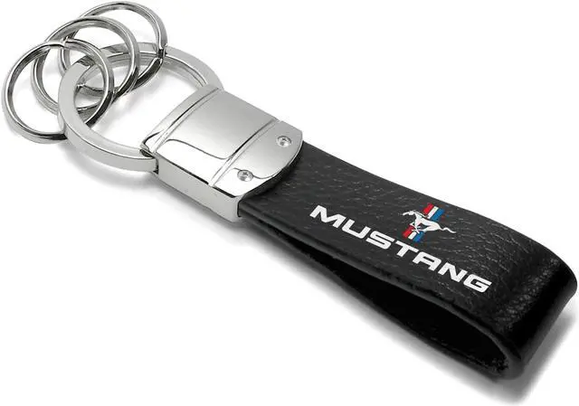 Ford Mustang Tri-Bar Black Real Leather Strap Chrome Round Hook Metal Key Chain