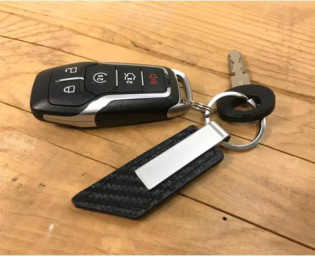 • High-quality black PU leather with carbon fiber texture. Flat split key ring.