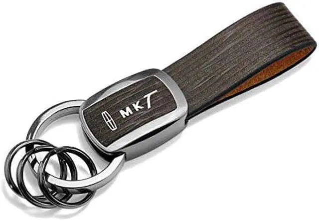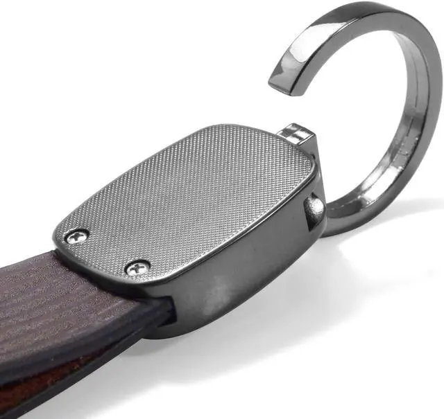 Fashion with style. One piece design has elegant look from every angle. Black nickel finish block with brown leather insert. It has full-color UV resistant OEM style car logo graphic. Top grade soft brown leather stripe and pull top hook with 3 rings for easy attach and release keys.