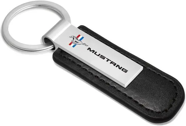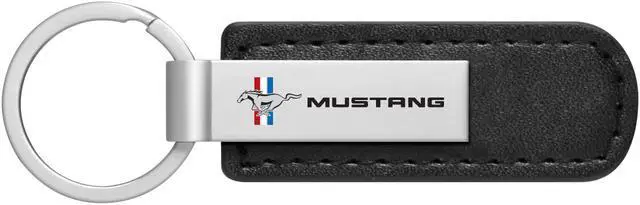 Ford Mustang Tri-Bar Silver Metal Black PU Leather Strap Key Chain