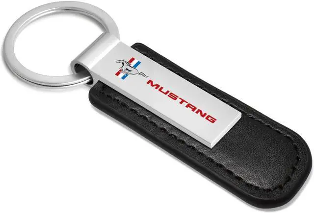 Ford Mustang Tri-Bar Red Silver Metal Black PU Leather Strap Key Chain