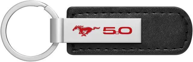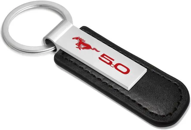 Ford Mustang 5.0 in Red Silver Metal Black PU Leather Strap Key Chain