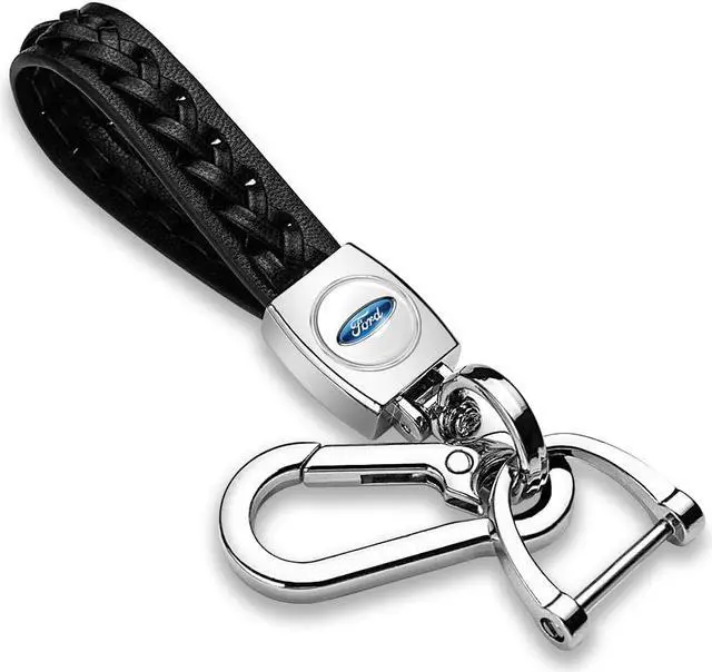 Ford Logo in White Braided Rope Style Genuine Black Leather Key Chain