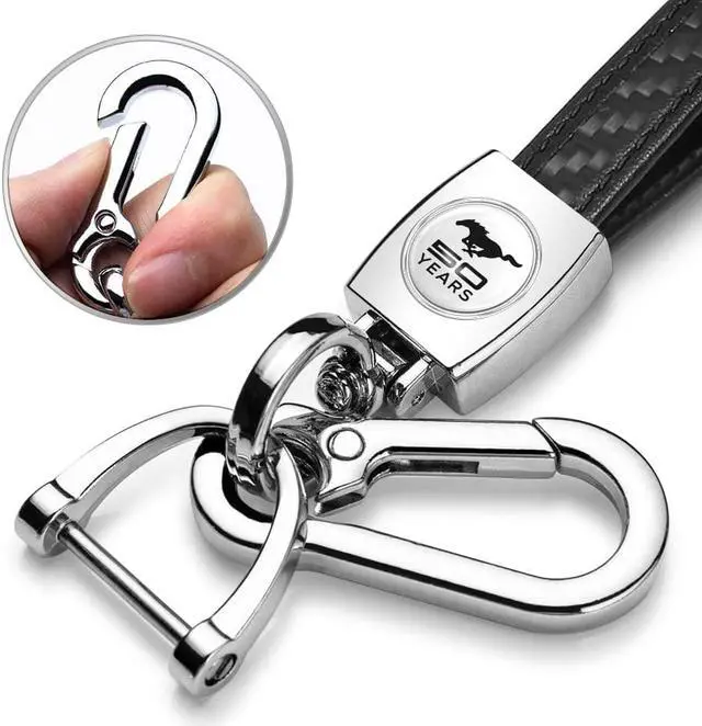 Ford Mustang 50 Years in White Real Carbon Fiber Strap Chrome Hook Key Chain