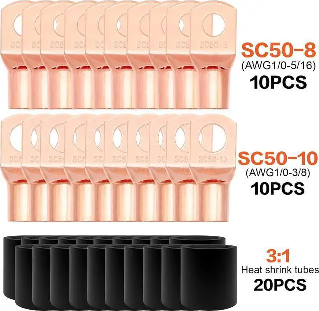 PACKAGE - 2 pcs 1/0 gauge black/red CCA power ground wire (20 feet of each color) 10pcs 1/0 AWG-3/8" Battery Lugs10pcs 1/0 AWG-5/16" Battery Lugs20pcs 3:1 Dual Wall Adhesive Heat Shrink Tubing; 1pc ANL Fuse Holder w/ 250 AMP ANL Fuse.
