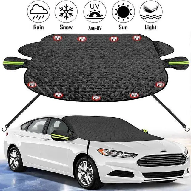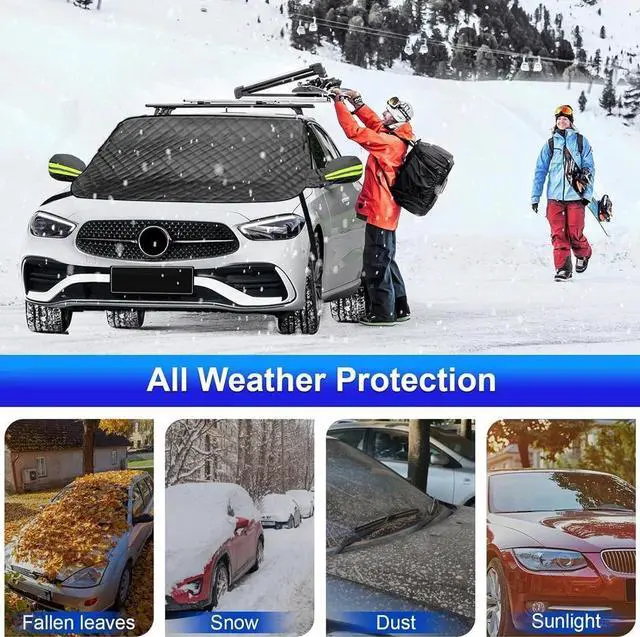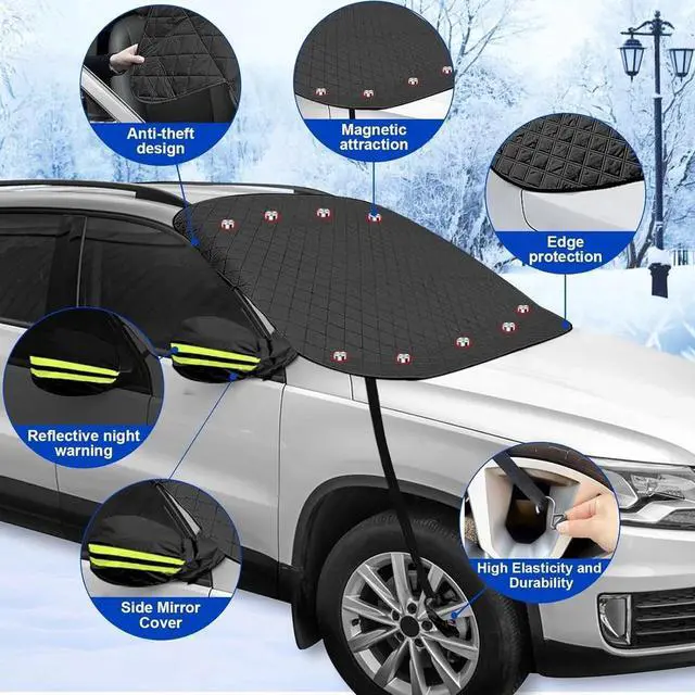 Innovative Design: The snow cover features magnetic edges that firmly attach to your car's metal body, ensuring a secure fit and preventing it from blowing away during gusty winds. The included side mirror protectors provide additional coverage, keeping your side mirrors free from snow and ice.