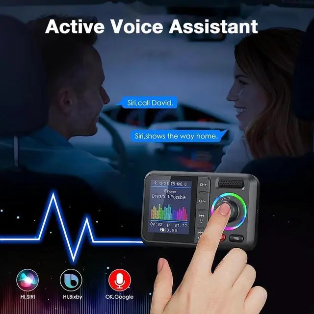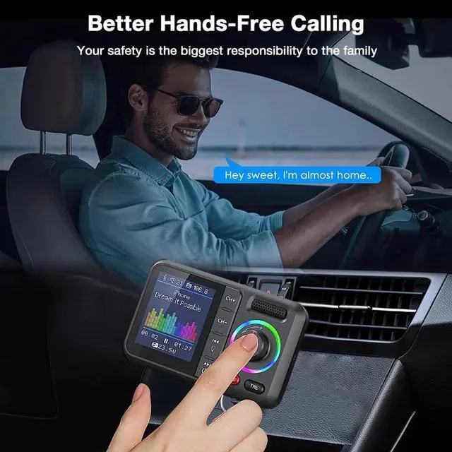 Colorful LCD Screen: This Bluetooth adapter is equipped with large LCD screen, providing more information than other products. Display details include Bluetooth name, FM channels, connected device name, car voltage, music title, music count, volume, incoming phone numbers and play status. The 360° flexible design ensures a comfortable visual experience and easy access for hands-free calling.