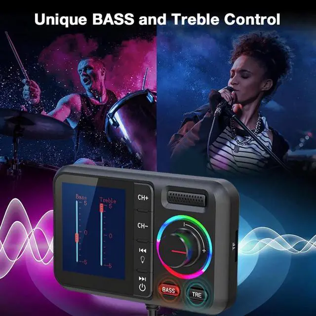 Enhanced Treble & Bass Control: Experience Hi-Fi sound with the FM transmitter, featuring independent treble and bass control for a personalized audio experience. Adjust the sound to your preference and enjoy audiophile-grade quality with an auto-syncing colorful music spectrum that creates the perfect party atmosphere.