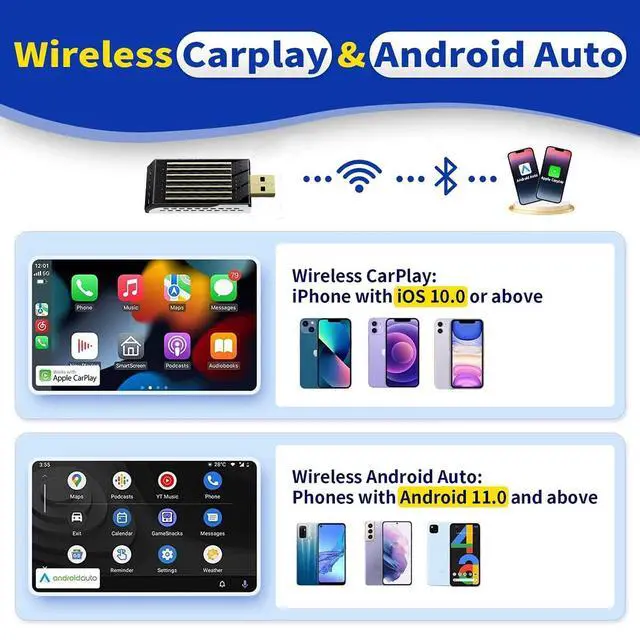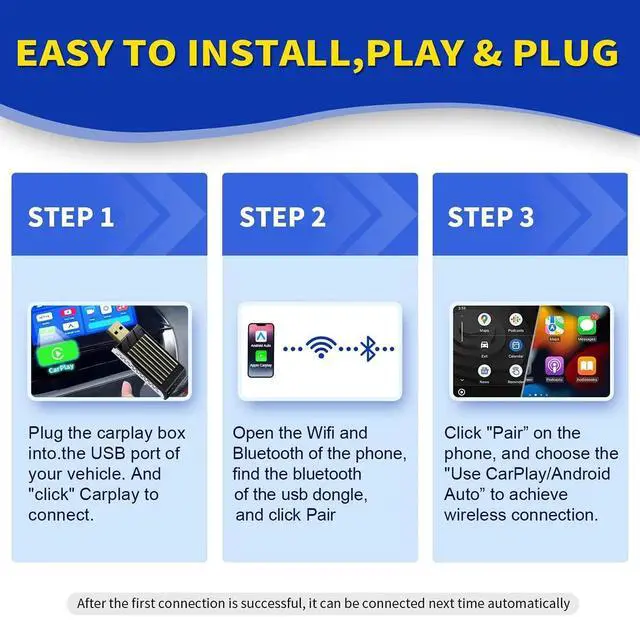 plug-and-play The IOS play wireless adapter is plug-and-play without any additional drivers. With just 3 steps to set up, the android Automatic Wireless dongle has a built-in Wi-Fi Bluetooth module that can quickly recognize and automatically connect to your phone. The iphone's wireless carplay adapter quickly connects to your Bluetooth for pairing in less than 10 seconds, and then you're ready to enjoy the carplay or Android Auto wireless adapter.