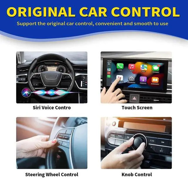 wired CarPlay to wireless CarPlay This Bluetooth CarPlay adapter converts your wired CarPlay to wireless CarPlay without affecting any of its functionality. The wireless android car adapter supports all the control methods of the original car, such as Siri voice control, steering wheel control, knob control, touch screen control, etc. The wireless IOS carplay adapter can help you get rid of troublesome cables, easily achieve wireless connectivity, and add more convenience to your travel.