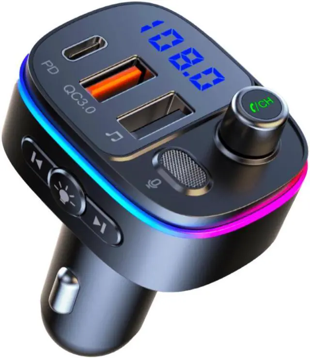 KEHIPI Bluetooth 5.0 FM Transmitter for Car, QC3.0+Type-C PD 20W Car Charger, Wireless FM Radio Bass Sound Music Player, Car Kit with Hands-Free Calls, Support U Disk,7 Colors LED Backlit