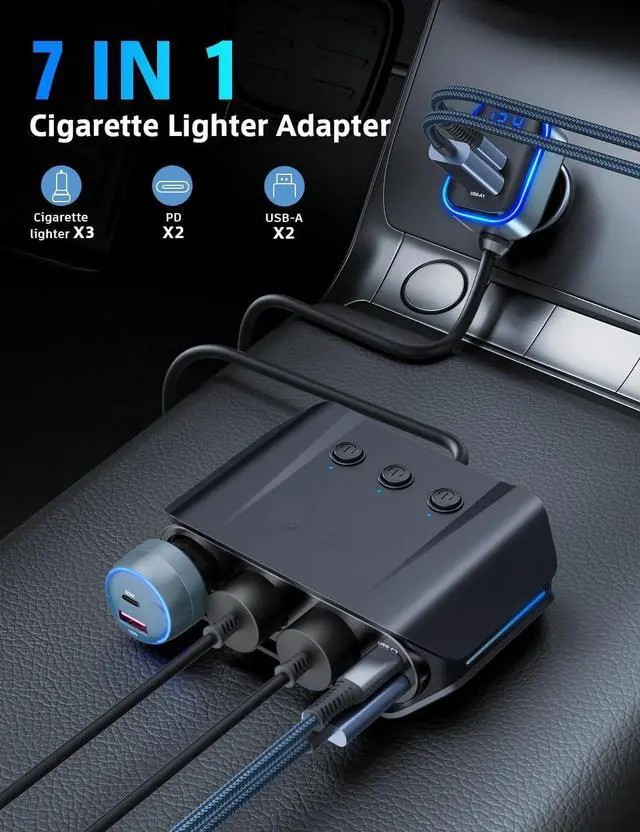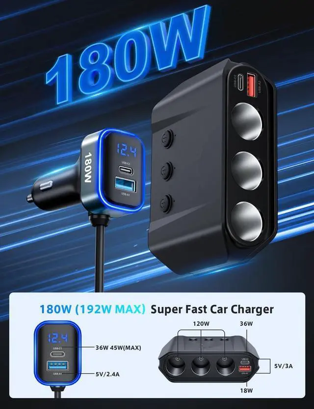 7-in-1 Cigarette Lighter Ignition Splitter, 180W (192W max) with Dual PD 36W/QC3.0 Fast Charging (3.7FT Cable) 12V/24V Independent Switching and LED Voltage Display