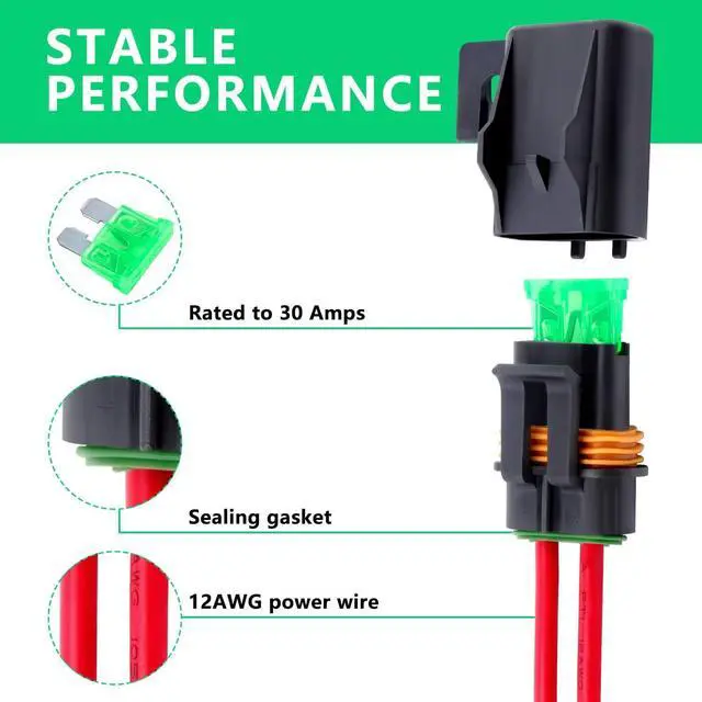 SpecificationsPackage includes: 6 x inline holders, 6 x 30A fuses. Fuse holders are made of high quality galvanized copper, heavy duty 12AWG power cord made of pure oxygen free copper as conductor, cable meets standard 12AWG, rated at 30AMP, good conductivity.