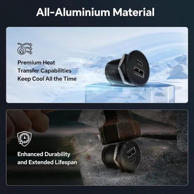 ALUMINUM CONSTRUCTION AND SAFETY: Made of sturdy aluminum, the USB socket excels in heat dissipation and durability. With an integrated smart protection chip and fuse, it protects your device for worry-free travel