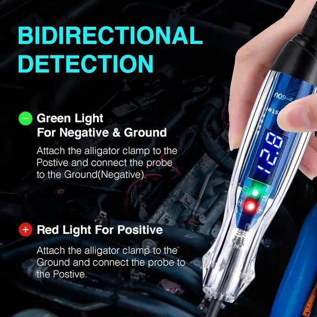 [LED Indication, Bidirectional Voltage Test]: This upgraded circuit test light is a bidirectional voltage tester. You can connect the alligator clips to negative or positive ground, there is also a light emitting diode on the circuit board for polarity indication, red light for positive polarity and green light for negative polarity.