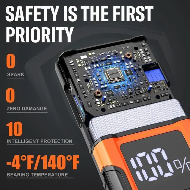 UPGRATE SAFETY PROTECTIONAX4500 portable car jump starter without worrying about incorrect connections. The battery starter has more than 10 types of safety protection, combined with heavy-duty jump clamps for a fast and safe start-up of a dead car battery, even in extreme temperatures (-4°F~140°F). AX4500 battery booster has a 4-inch LCD to indicate correct operation and power levelPD30W TYPE-C INPUT/OUTPUT QUICK CHARGEMore than a car battery Starter, the AX4500 Car Starter is designed with a PD30W Type-C Input/Output. The quick charge 3.0 USB port can fully charge your cellphones, tablets, and more at the fastest (up to 50 % faster than a standard charger)IN THE BOXAX4500 Car Jump Starter x1, Jumper Cable x1, USB Type-C Charging Cable x1, USB Type-A Charging Cable x1, Storage Case x1, Cigarette Lighter Adapter x1, User Manual x1, 2-Years Technical Support.