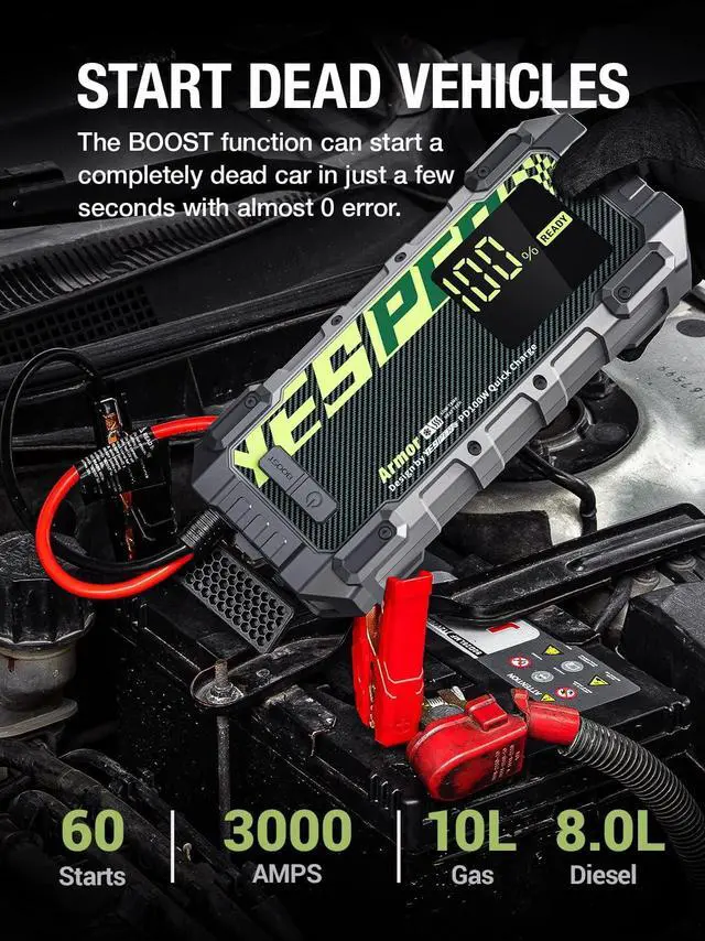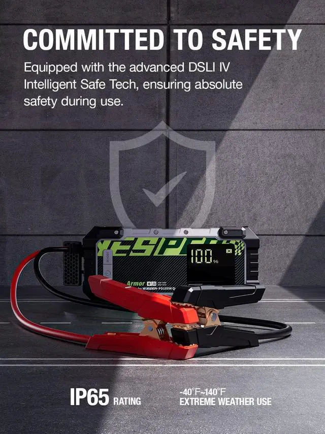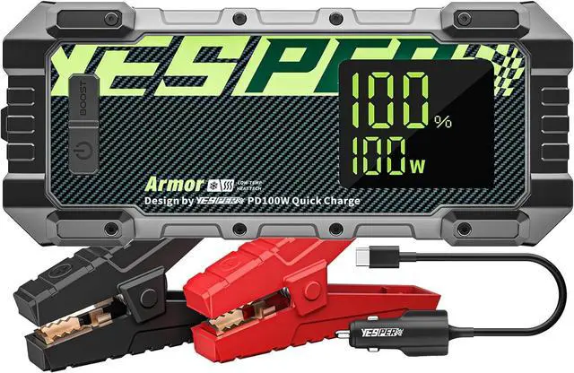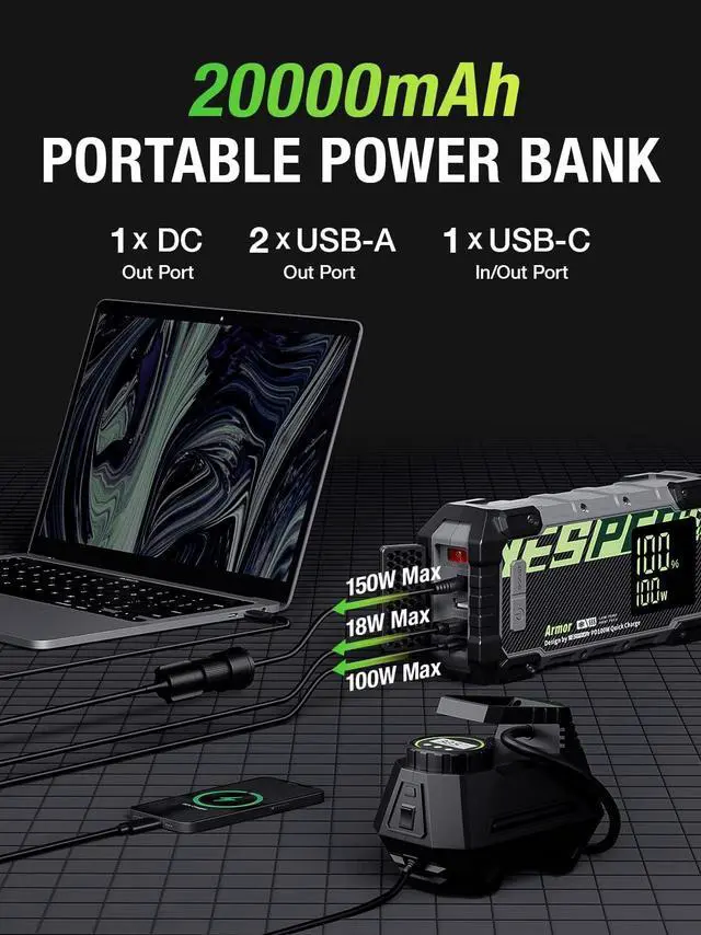 [Committed to Safety]- The Hi-Tech start clamps and 10 protections free you from worrying about misoperation and sparks; the IP65-rated sturdy and durable case make the portable jump starter waterproof, dustproof and drop-proof[PD100W USB-C Fast Charging]-The jump starter power pack can be charged from 0% to 100% in 45mins via included 100W car charger. Even if you forget to recharge the jumper pack before going out, 5 minutes of charging are enough to start a car[Beyond A Jump Starter]- Serves as a 20000mAh portable power bank, recharging smartphones, tablets, and other USB devices; as a 15-volt portable power, powering all 15V/12V DC devices, like tire inflators, inverters, and more[Advanced Design]- 3.2 -inch easy-to-read screen to help you keep abreast of power information; equipped with 400 lumens LED light, three