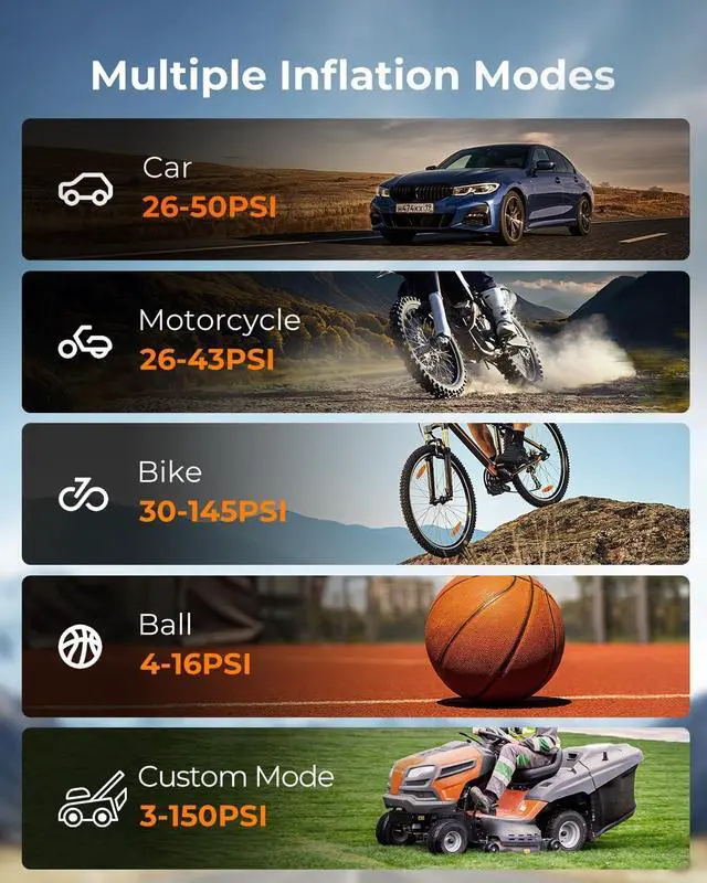 [Easy One-Press Setting] The Syncwire smart air pump features an easy one-press setting with 5 inflation modes for cars, motorcycles, bikes, balls, and a customizable mode. It offers 4 preset pressure units (PSI, KPA, BAR, KG/CM²) and allows effortless selection of mode and unit with a single press. The pump automatically stops when it reaches the preset pressure, eliminating the need for constant monitoring. [All-in-one Powerful Functions] Syncwire portable air pump includes a long air hose and various nozzle adapters to inflate car, motorcycle, and bicycle tires, sports equipment and more.